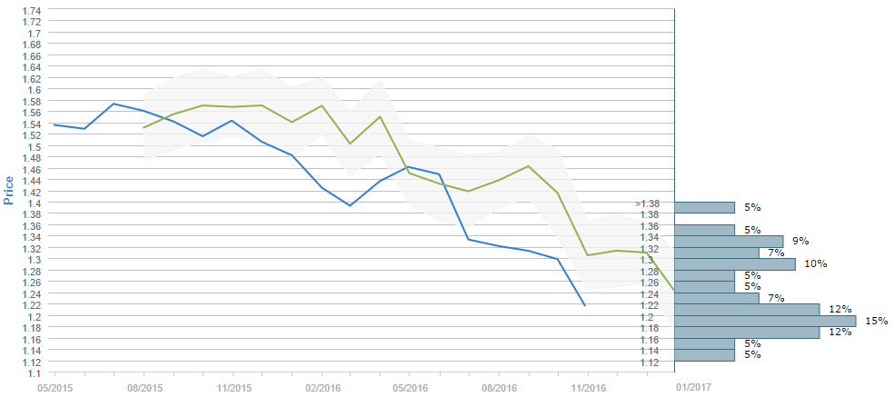 By the end of the next three months traders expect the Cable to be higher than the level where it is now. While the current price is around 1.23, the average forecast for January 28 is 1.2433. Furthermore, the 1.18-1.20 interval is now the most popular one, having 15% of the votes. On the second place in terms of the votes are the 1.16-1.18 (12%) and the 1.20-1.22 (12%) intervals, followed also by the 1.28-1.30 with 10% of the votes. Moreover, 76% all survey participants believe the Cable is to fall under 1.30.