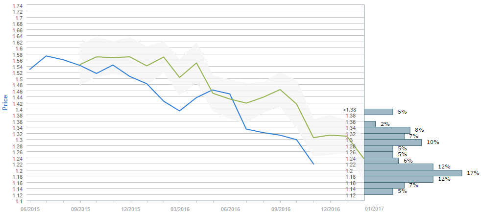 By the end of the next three months traders expect the Cable to be higher than the level where it is now. While the current price is around 1.22, the average forecast for January 31 is 1.2365. Furthermore, the 1.18-1.20 interval is now the most popular one, having 17% of the votes. On the second place in terms of the votes are the 1.16-1.18 (12%) and the 1.20-1.22 (12%) intervals, followed also by the 1.28-1.30 with 10% of the votes. Moreover, 79% all survey participants believe the Cable is to fall under 1.30.