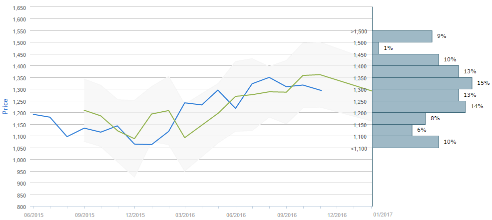 Traders who were asked regarding their longer-term views on gold between October 2 and November 2 expect, on average, to see the metal below 1,300 in February. Generally, 48% of participants believe the price will be above 1,300 in ninety days. Alongside, 35% (-1%) of those surveyed reckon the price will trade in the range between 1,150 and 1,300 over the next three months.