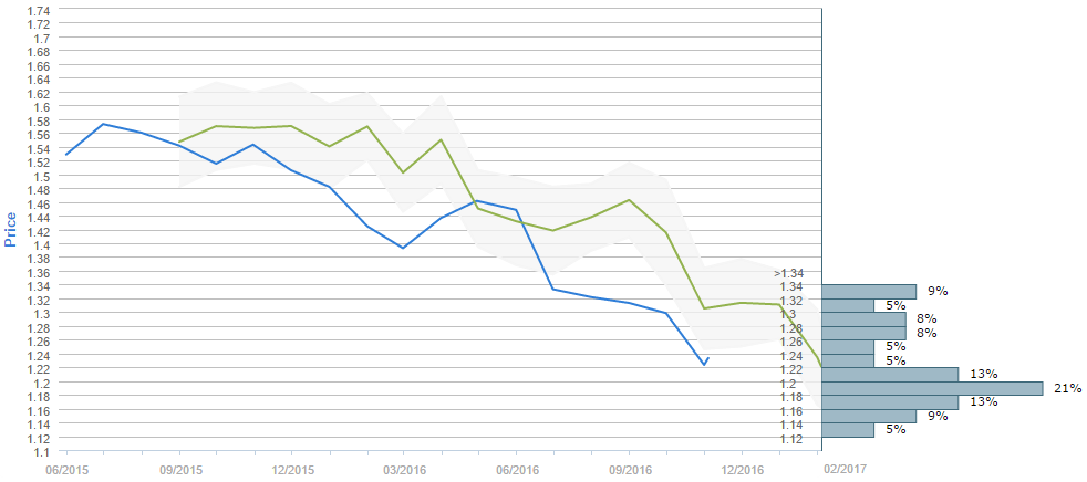By the end of the next three months traders expect the Cable to be higher than the level where it is now. While the current price is around 1.22, the average forecast for November 03 is 1.2226. Furthermore, the 1.18-1.20 interval is now the most popular one, having 21% of the votes. On the second place in terms of the votes are the 1.16-1.18 (13%) and the 1.20-1.22 (13%) intervals, followed also by the 1.32-1.34 with only 9% of the votes. Moreover, 71% all survey participants believe the Cable is to fall under 1.26.