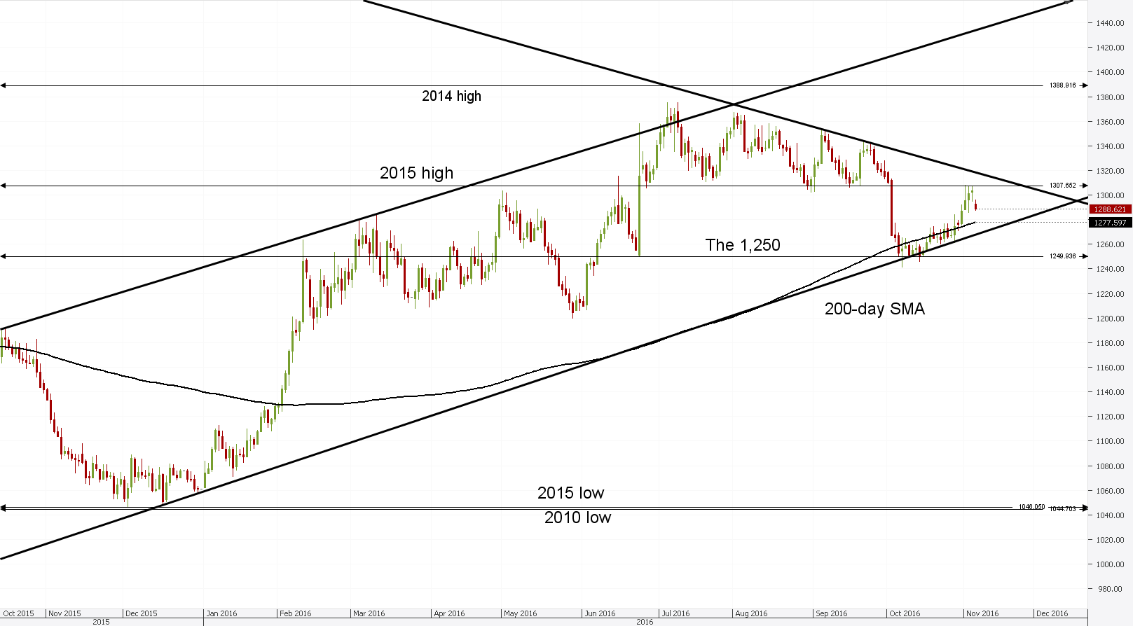 Daily chart: The yellow metal's price declined on early Monday morning, as the bullion started the session a lot lower than the previous close. The lower opening was caused by the fact that the FBI Director James Comey sent another letter to the congress. This time it was mentioned that the conclusions expressed in July by the FBI have not changed after the latest review. The short version is – Clinton will not be charged by the FBI, ignoring the fact that the guilt of the presidential candidate has been proven.SWFX traders are neutral