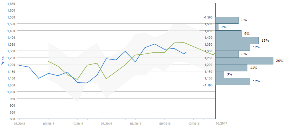 Traders who were asked regarding their longer-term views on gold between October 7 and November 7 expect, on average, to see the metal below 1,300 in February. Generally, 45% (-2%) of participants believe the price will be above 1,300 in ninety days. Alongside, 39% of those surveyed reckon the price will trade in the range between 1,150 and 1,300 over the next three months.