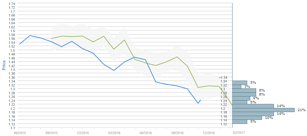 By the end of the next three months traders expect the Cable to be higher than the level where it is now. While the current price is around 1.24, the average forecast for November 07 is 1.2131. Furthermore, the 1.18-1.20 interval is now the most popular one, having 21% of the votes. On the second place in terms of the votes are the 1.16-1.18 (14%) and the 1.20-1.22 (14%) intervals, followed also by the 1.14-1.16 with only 10% of the votes. Moreover, 75% all survey participants believe the Cable is to fall under 1.26.