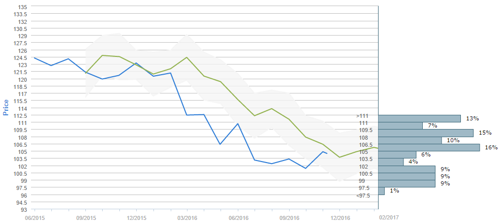 According to the poll that gathered forecasts between October 07 and November 07, traders expect the US Dollar to appreciate to 105.53 yen in three months' time, while the forecast for November 30 was only 103.30 yen. It is also worth noticing that 71% of all forecasts fall above 102 yen, which is close to the current spot price. By far the most popular interval is the 105.00-106.50 one, chosen by 16% of all the surveyed, compared to popularity of the 106.50-108.00, 108.00-109.50 and 109.50-111.00 intervals.