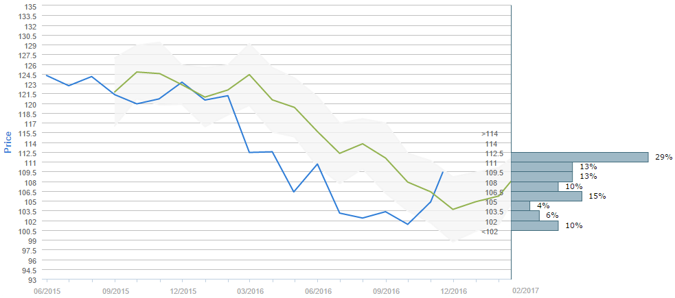 According to the poll that gathered forecasts between October 16 and November 16, traders expect the US Dollar to appreciate to 107.97 yen in three months' time, while the forecast for November 30 was only 103.30 yen. It is also worth noticing that 55% of all forecasts fall above 108 yen, which is close to the current spot price. The majority of people voted expect the US Dollar to cost somewhere between 111.00 and 112.50 yen in three months, with 29% of the survey participants choosing that trading range. Meanwhile, the second most popular interval is the 105.00-106.50 one, chosen by 15% of all the surveyed, compared to popularity of the 106.50-108.00, 108.00-109.50 and 109.50-111.00 intervals.