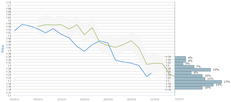 By the end of the next three months traders expect the Cable to be higher than the level where it is now. While the current price is around 1.24, the average forecast for November 17 is 1.2266. Furthermore, the 1.18-1.20 interval is now the most popular one, having 17% of the votes. On the second place in terms of the votes is the 1.16-1.18 (14%) interval, followed also by the 1.26-1.28 interval with only 13% of the votes. Moreover, 62% all survey participants believe the Cable is to fall under 1.24.