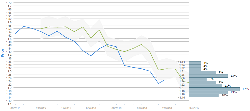 By the end of the next three months traders expect the Cable to be higher than the level where it is now. While the current price is around 1.24, the average forecast for November 18 is 1.2294. Furthermore, the 1.18-1.20 interval is now the most popular one, having 17% of the votes. On the second place in terms of the votes are the 1.16-1.18 (13%) and the 1.26-1.28 (13%) intervals, followed also by the 1.20-1.22 intervals with only 11% of the votes. Moreover, 60% all survey participants believe the Cable is to fall under 1.24.