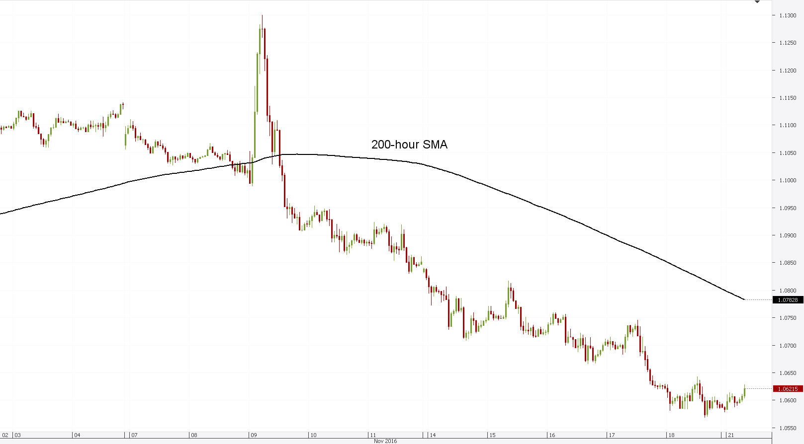 Daily Chart: The common European currency was almost unchanged against the US Dollar on Monday morning near the level of 1.06. However, the pair still was in the middle of the descending channel pattern, in which it had been moving lower since encountering the 55 and 100-day SMAs at 1.1135 on third of November. It is most likely that the currency exchange rate will continue to move lower, as the closest support cluster is located around the 1.0520 level. The pair will probably find support there at some point during the week.Daily chart