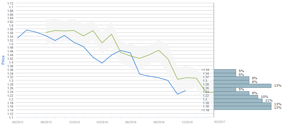 By the end of the next three months traders expect the Cable to be higher than the level where it is now. While the current price is around 1.24, the average forecast for November 25 is 1.2336. Furthermore, the 1.14-1.16, the 1.16-1.18 and the 1.26-1.28 intervals are now the most popular ones, having 13% of the votes each. On the second place in terms of the votes is the 1.18-1.20 (11%) interval, followed also by the 1.20-1.22 interval with only 10% of the votes. Moreover, 55% all survey participants believe the Cable is to fall under 1.24.
