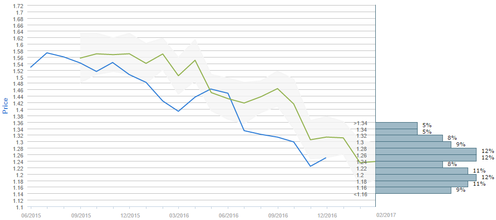 By the end of the next three months traders expect the Cable to be higher than the level where it is now. While the current price is around 1.24, the average forecast for February 28 is 1.2382. Furthermore, the 1.18-1.20, the 1.24-1.26 and the 1.26-1.28 intervals are now the most popular ones, having 12% of the votes each. On the second place in terms of the votes are the 1.16-1.18 (11%) and the 1.20-1.22 (11%) intervals, followed also by the 1.14-1.16 and 1.28-1.30 intervals, both with only 9% of the votes. Moreover, 51% all survey participants believe the Cable is to fall above 1.24.