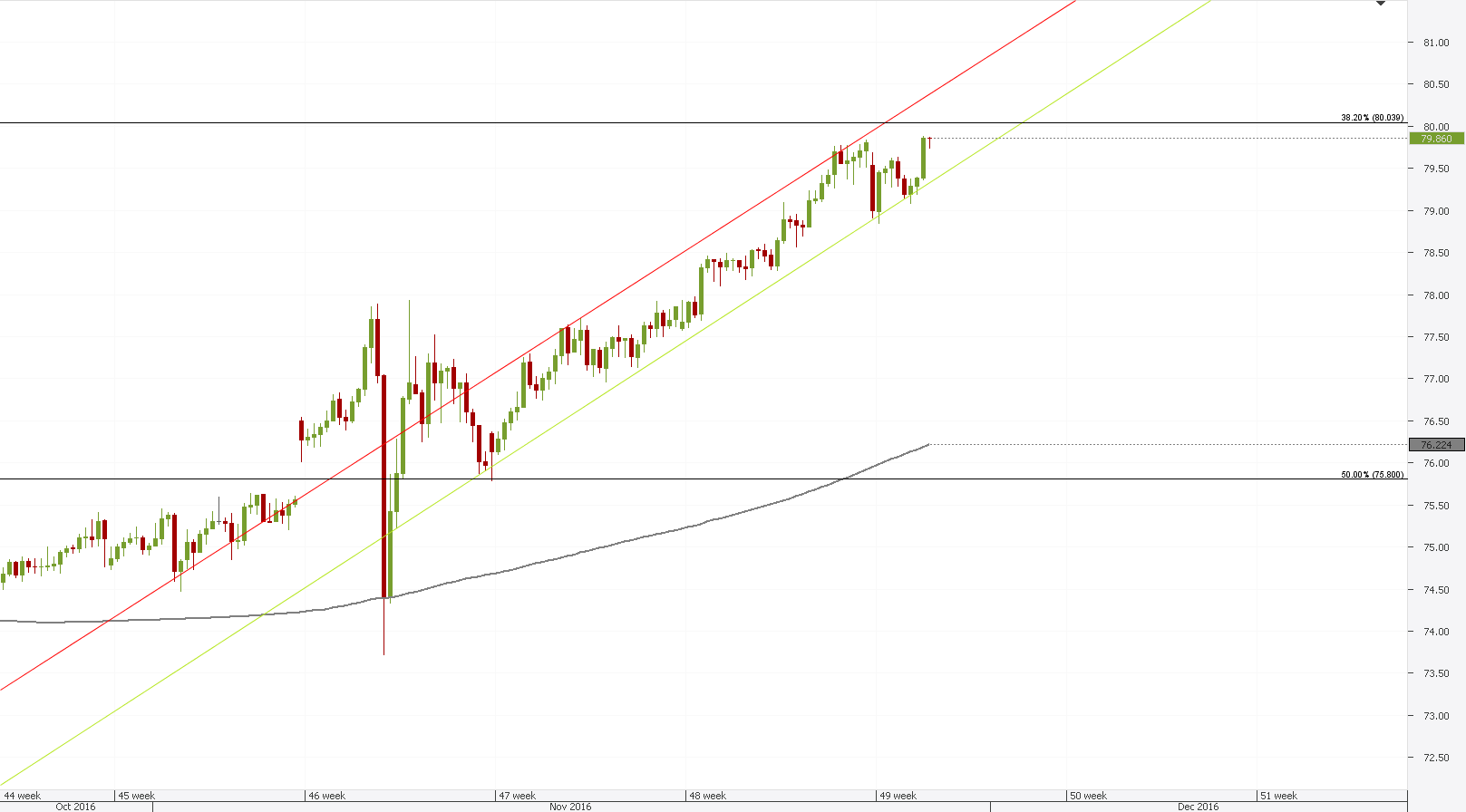 The New Zealand Dollar trades against the Japanese Yen in an unclear manner on a larger scale. It is clear that there is an ascending channel in the short term, but no larger pattern. However, after extensive search the reason was found. The pair trades between the Fibonacci retracement levels, which can be measured by connecting the 2012 low and 2014 high levels. The ascending channel pattern is a representation of the rates rebound against the 50.00% Fibonacci retracement level at 75.80 in the aftermath of the US presidential election, when the pair bounced around the retracement level. Most recently the rate approached the 38.20% level, and it is likely to break through the just mentioned level.