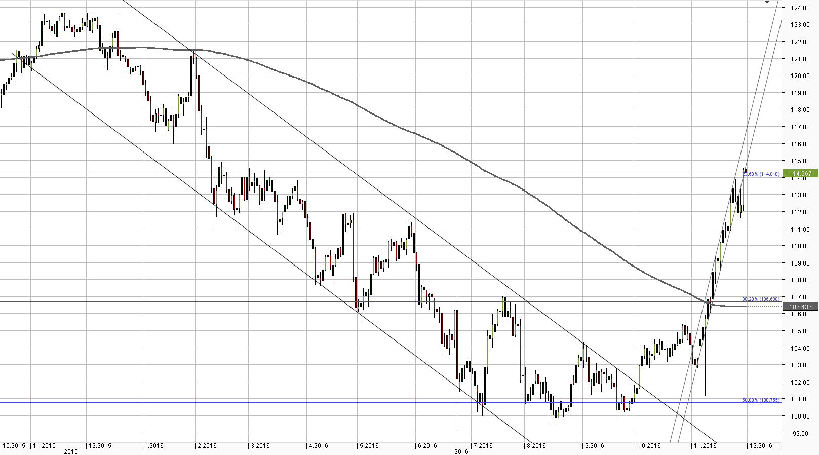 Amid strong US fundamental figures on Wednesday, the American Dollar gained more than 200 pips against the Japanese Yen, thus, climbed over the 23.60% Fibo level, which caused the pair to exit its ascending channel pattern. The Buck now has a chance to not only retake the 115.00 level, but even the 116.00 mark, despite the weekly R2 and the Bollinger band forming relatively strong resistance there. However, the USD/JPY pair is first required to pierce the weekly R1 at 114.70, which appears to be causing setbacks in the Greenback's bullish trend. As a result, a small corrective decline is possible today, but with the 113.00 mark remaining intact.Daily chart