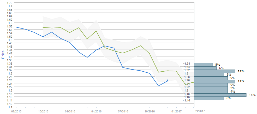 By the end of the next three months traders expect the Cable to be higher than the level where it is now. While the current price is around 1.24, the average forecast for March 02 is 1.2409. Furthermore, the 1.16-1.18 interval is now the most popular ones, having 14% of the votes. On the second place in terms of the votes are the 1.24-1.26 (11%) and the 1.30-1.32 (11%) intervals, followed also by the 1.18-1.20, 1.20-1.22, 1.22-1.24 and 1.26-1.28 intervals, all with only 9% of the votes. Moreover, 51% all survey participants believe the Cable is to fall above 1.24.
