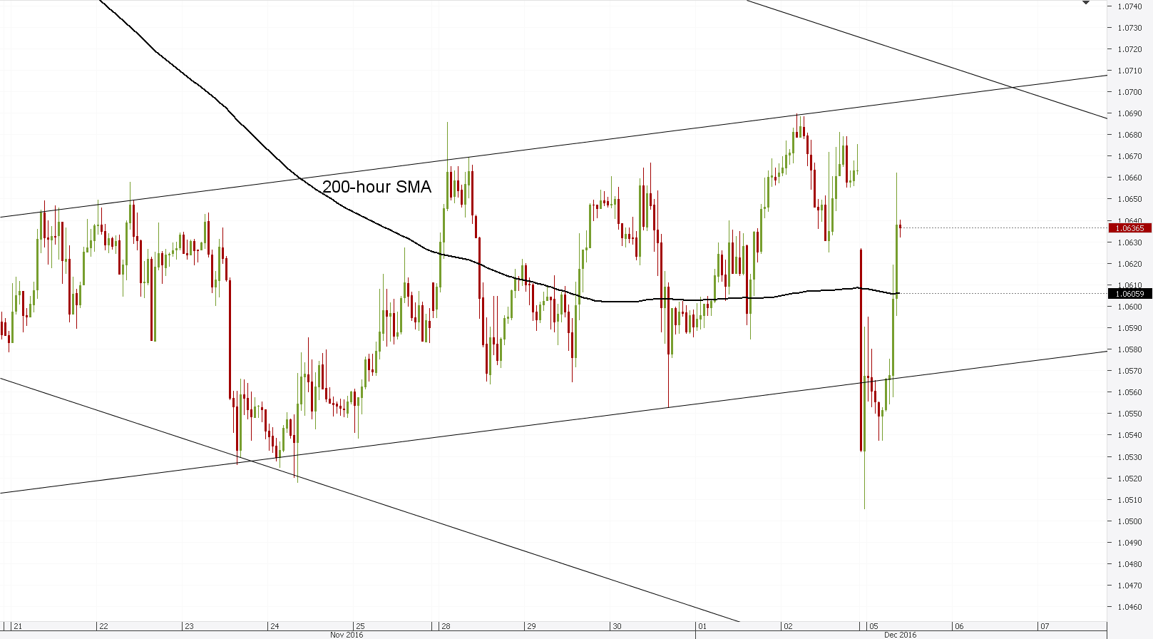 Daily Chart: EUR/USD showed a 0.3% gap Monday morning, and went on to become a green candle in the making. The pair slid beneath the weekly S1 at 1.0581 with ease, and appeared to be targeting November lows at 1.0550. Given the scope of the early dive, it seemed like the rate could post significant losses this session and leave little to December 2015 lows at 1.0522. A close below this level would strengthen the bearish outlook and tackle levels unseen since March 2015 – a scenario that is starting to gain more and more ground as the set of daily and hourly channels go out of line. However, a quick reverse from the gloomy trend showed fundamentals dominating the market, which causes technical factors to lose our trust.Sentiment remains bullish