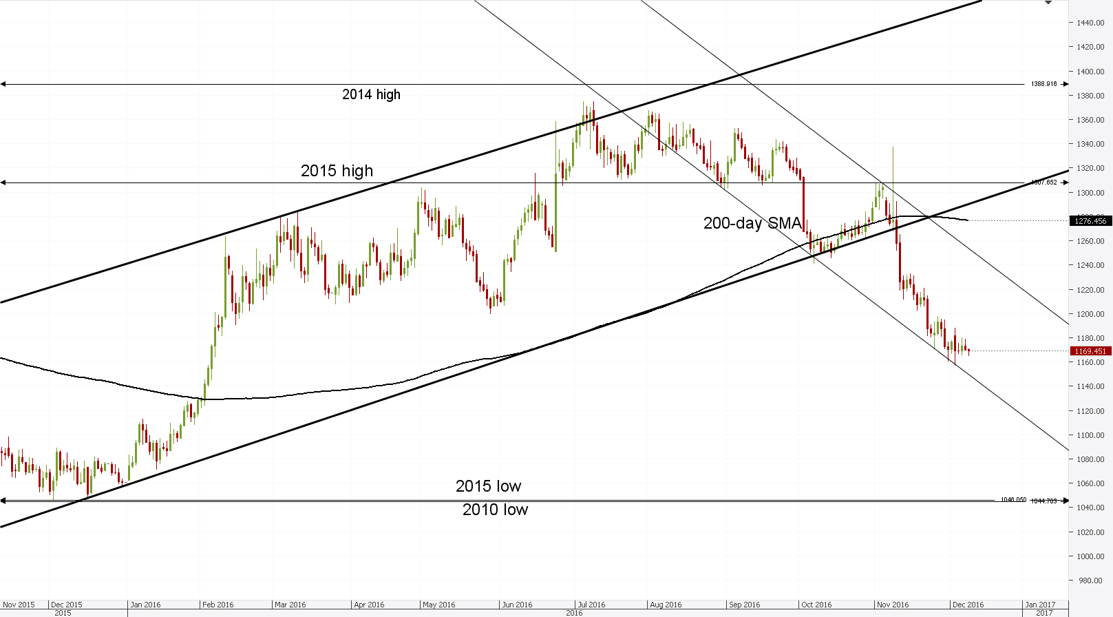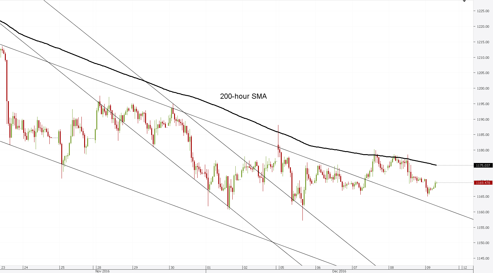 Hourly chart: The hourly chart shows an apparent correction of the channel upper trend-line which has now led to a surge. The next targets lie at 1,171.41 and 1,172.30 and correspond to the 100 and 55 hour SMAs respectively. The SMAs have just crossed to the upside, sending a strong bullish signal for Gold. Additionally, a falling wedge has been sketched and has led to a build-up of bullish potential. The short-time frame picture also shows the rate climbing back above 1,169.10 again.