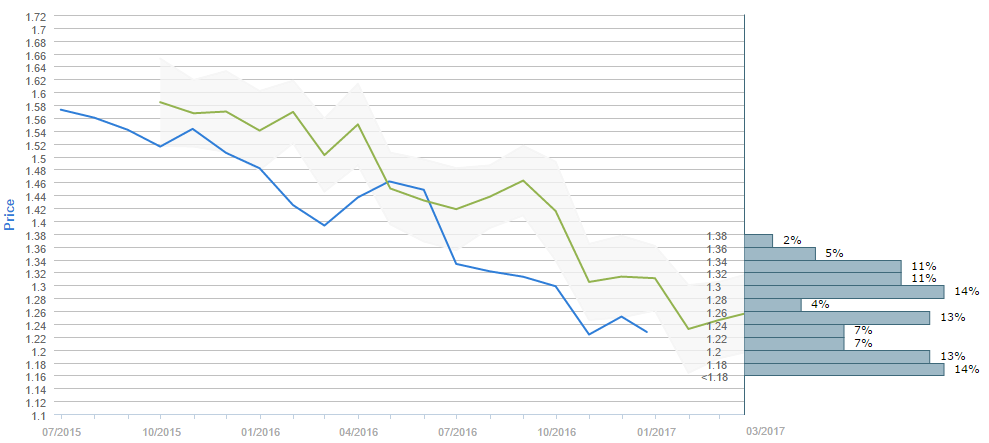 By the end of the next three months traders expect the Cable to be higher than the level where it is now. While the current price is around 1.24, the average forecast for March 23 is around 1.26. Furthermore, the 1.28-1.30 and the <1.18 intervals are now the most popular ones, having 14% of the votes each.