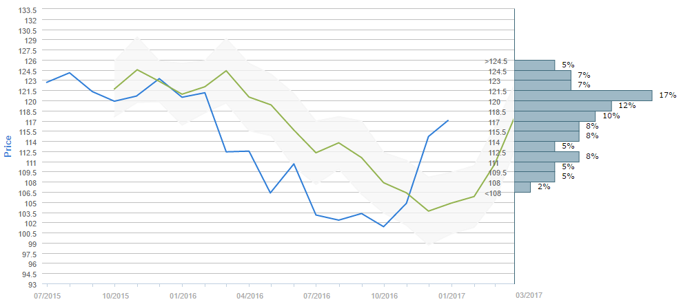 According to the poll that gathered forecasts between November 26 and December 26, traders expect the US Dollar to appreciate to above 117 yen in three months' time, while the forecast for November 30 was only 103.30 yen. It is also worth noticing that 58% of all forecasts fall above 117 yen, which is close to the current spot price. The majority of people who voted expect the US Dollar to cost somewhere between 120.00 and 121.50 yen in three months, with 17% of the survey participants choosing this trading range.