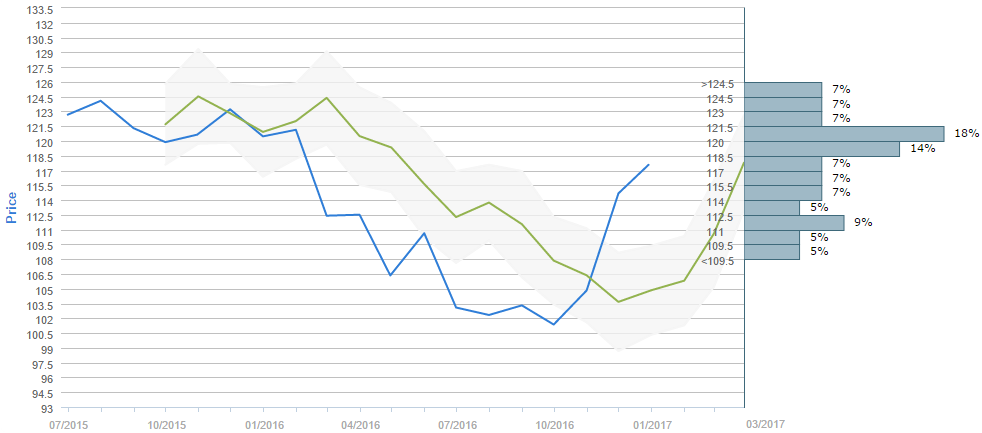 According to the poll that gathered forecasts between November 28 and December 28, traders expect the US Dollar to appreciate to 117.8 yen in three months' time, while the forecast for November 30 was only 103.30 yen. It is also worth noticing that 60% of all forecasts fall above 117 yen, which is close to the current spot price. The majority of people voted expect the US Dollar to cost somewhere between 120.00 and 121.50 yen in three months, with 18% of the survey participants choosing this trading range. At the same time, the second most popular interval was the 118.50-120.00 one, with 14% of survey participants choosing it.