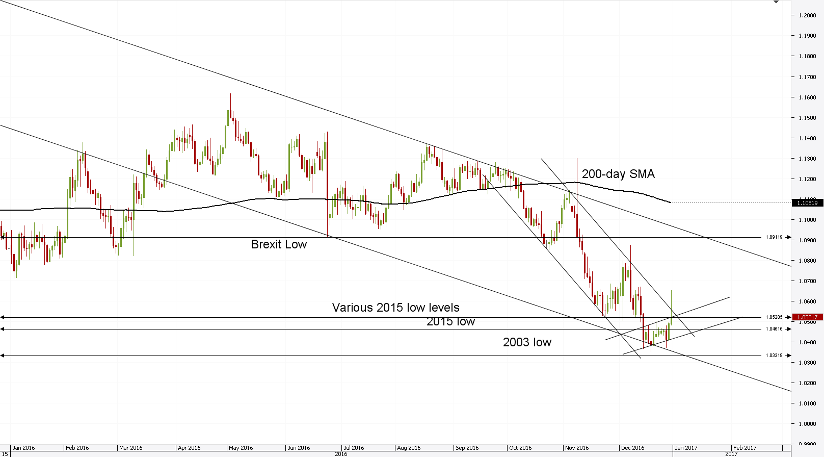 Daily Chart: During the early hours of Friday's trading session all of the technical analysis of the EUR/USD currency exchange rate experienced a shock. The shock came in the form of a surge up to the 1.0653 mark. It was supposedly caused by a rush of computer generated orders. It seems that an algorithm run fund with enough funds to cause such a move changed its forecast for the pair from short to long. At that moment, as the algo recalculated the outlook of the pair it put out the buy orders, and that caused the jump.Daily chart