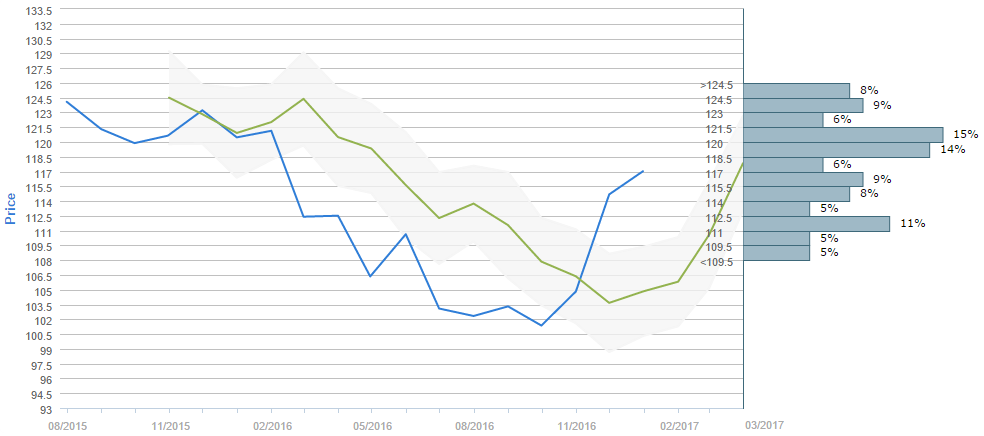 According to the poll that gathered forecasts between November 30 and December 30, traders expect the US Dollar to appreciate to 117.84 yen in three months' time, while the forecast for November 30 was only 103.30 yen. It is also worth noticing that 58% of all forecasts fall above 117 yen, which is close to the current spot price. The majority of people voted expect the US Dollar to cost somewhere between 120.00 and 121.50 yen in three months, with 15% of the survey participants choosing this trading range. At the same time, the second most popular interval was the 118.50-120.00 one, with 14% of survey participants choosing it.
