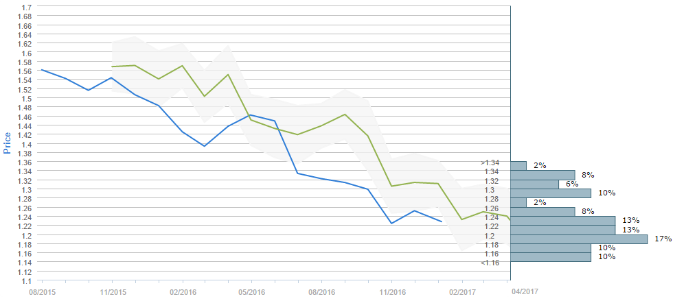 By the end of the next three months traders expect the Cable to fall under the 1.24 major level, as 63% of survey participants believe so. While the current price is around 1.23, the average forecast for April 04 is 1.2308. However, the 1.18-1.20 interval is now the most popular one, having 17% of the votes, while on the second place are the 1.20-1.22 and the 1.22-1.24 price ranges, with 13% of poll participants choosing each of them. Furthermore, the 1.14-1.16, the 1.16-1.18 and the 1.28-1.30 intervals were chosen by 10% of the voters each.