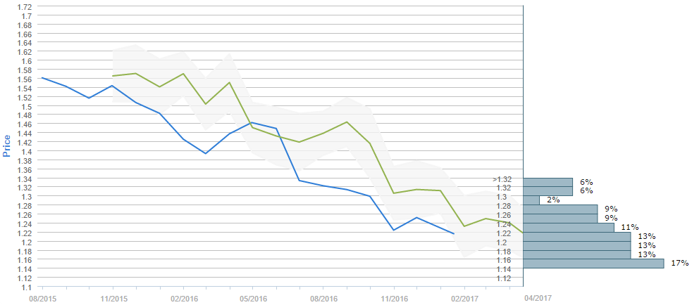 By the end of the next three months traders expect the Cable to fall under the 1.22 major level, as 56% of survey participants believe so. While the current price is around 1.20, the average forecast for April 17 is 1.2175. However, the 1.14-1.16 interval is now the most popular one, having 17% of the votes, while on the second place are the 1.16-1.18, the 1.18-1.20 and the 1.20-1.22 price ranges, with 13% of poll participants choosing each of them. Furthermore, the 1.22-1.24 interval was chosen by 11% of the voters.