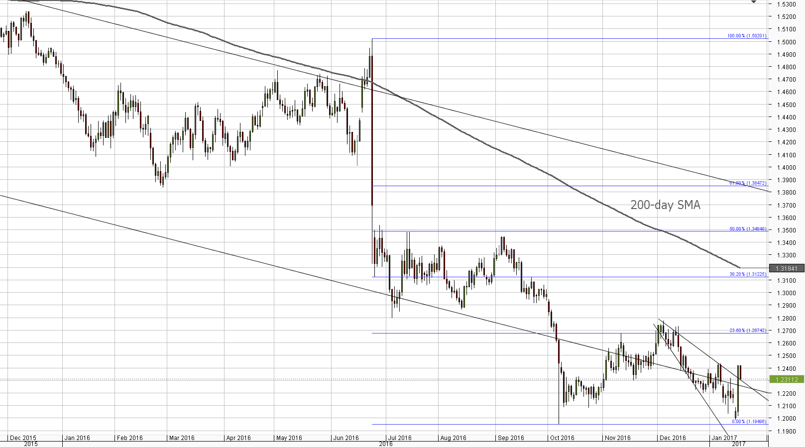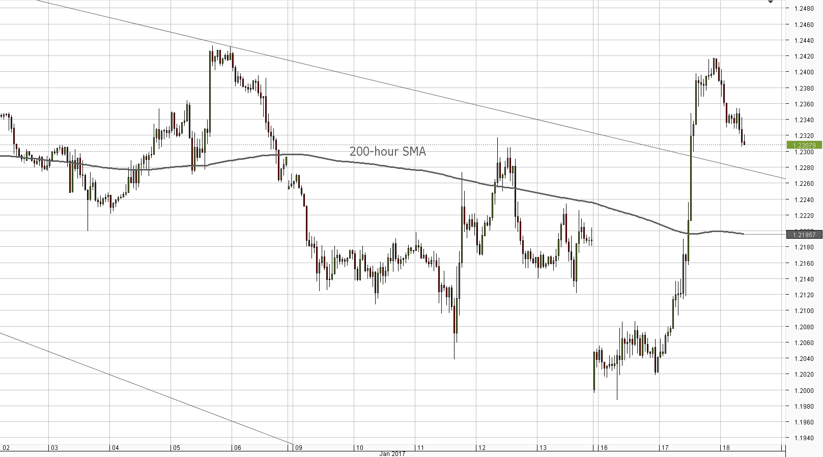 On Tuesday the GBP/USD pair experienced the strongest rally in almost 20 years, amid UK May's comments and upbeat UK inflation data. Having surged 363 pips, the Cable fully realised the falling wedge pattern, as its upper trend-line was pierced yesterday. Moreover, the 1.24 major level was retaken, with the 55-day SMA managing to provide sufficient resistance to limit the gains. The same SMA keeps providing resistance today, also being bolstered by the Bollinger band, the monthly PP and the weekly R2, which altogether are likely to cause the Pound to undergo a bearish correction. The weekly R1 at 1.2324 is the closest support, which is expected to limit the possible losses.