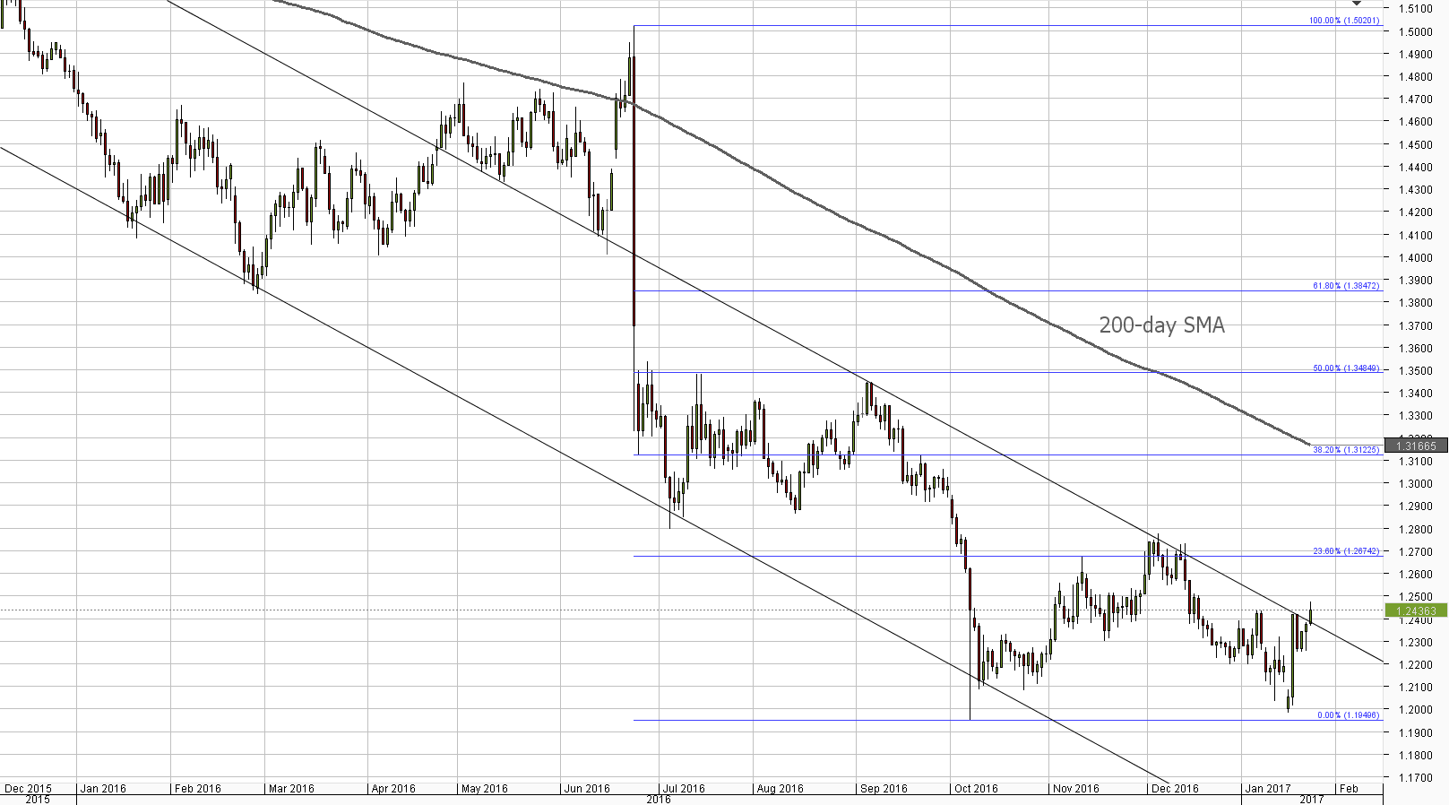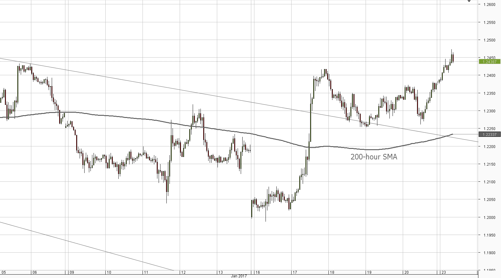 The Pound managed to end trade in the green zone on Friday, with the upper trend-line of the seven-month descending channel pattern limiting the gains. Today the British currency appears to have retained its post-inauguration strength, attempting to post more gains against the US Dollar. Another rally would imply a breach of the channel's upper border, suggesting that more GBP/USD strength is to follow. The immediate resistance area around 1.2440 is unlikely to hold the Cable from climbing higher, but the second cluster, formed by the 100-day SMA and the weekly R1, has a better chance of succeeding. The base case scenario, however, is a surge not further than 1.25.