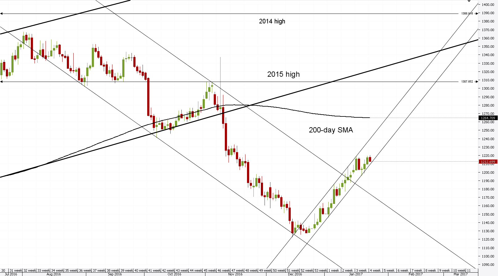 Daily chart: As forecasted before, the yellow metal surged back up to the resistance cluster, which surrounds the 1,220 mark, and bounced off it. The recent movements have forced analysts to adjust the medium term forecasts, as the latest sessions have revealed the true location of the lower trend line of the medium term ascending channel pattern. In accordance with the pattern the bullion is set to remain below the 1,220 level until January 26, when the lower trend line of the pattern is set to force the commodity price higher.Daily chart