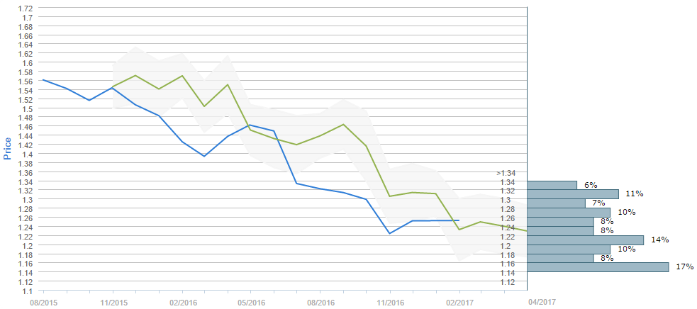 By the end of the next three months traders expect the Cable to fall under the 1.22 major level, as 50% of survey participants believe so. While the current price is around 1.25, the average forecast for April 30 is 1.2292. However, the 1.14-1.16 interval is now the most popular one, having 17% of the votes, while on the second place is the 1.20-1.22 price range, with 14% of poll participants choosing it. Furthermore, the 1.30-1.32 interval was chosen by 11% of the voters.