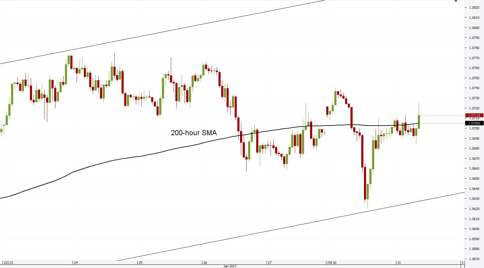 Hourly chart: The hourly chart reveals that the currency exchange rate, after bouncing off the weekly PP, fell below a cluster of all of the SMAs used in technical analysis by Dukascopy. If the SMAs manage to provide enough resistance to the EUR/USD pair, then the pair is surely set to fall down to the weekly S1, which is at 1.0644.