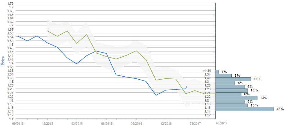 By the end of the next three months traders expect the Cable to fall under the 1.22 major level, as 50% of survey participants believe so. While the current price is around 1.25, the average forecast for May 02 is 1.2287. However, the 1.14-1.16 interval is now the most popular one, having 18% of the votes, while on the second place is the 1.20-1.22 price range, with 13% of poll participants choosing it. Furthermore, the 1.30-1.32 interval was chosen by 11% of the voters.