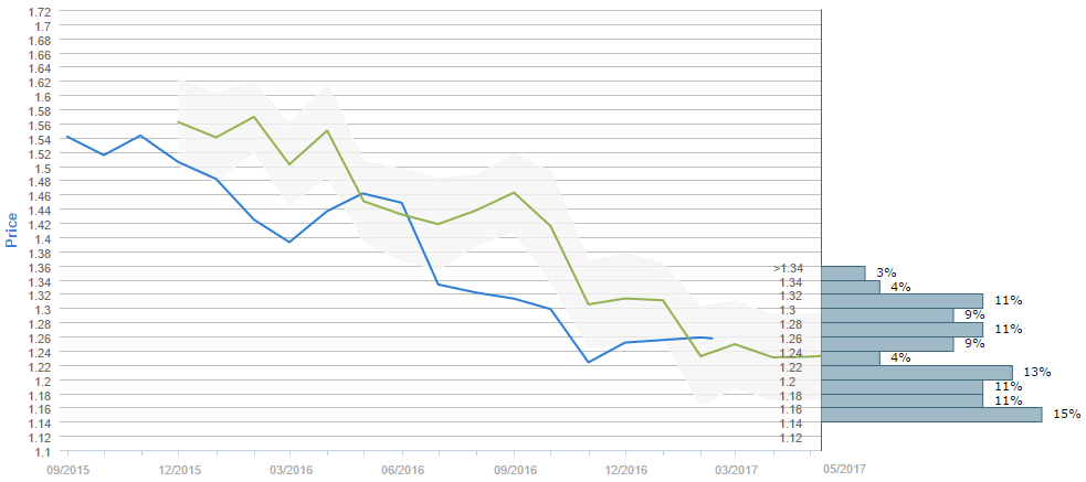 By the end of the next three months traders expect the Cable to rise above the 1.22 major level, as 51% of survey participants believe so. While the current price is around 1.25, the average forecast for May 09 is 1.2324. However, the 1.14-1.16 interval is now the most popular one, having 15% of the votes, while on the second place is the 1.20-1.22 price range, with 13% of poll participants choosing it. Furthermore, the 1.16-1.18, 1.18-1.20, 1.26-1.28 and the 1.30-1.32 intervals were each chosen by 11% of the voters.