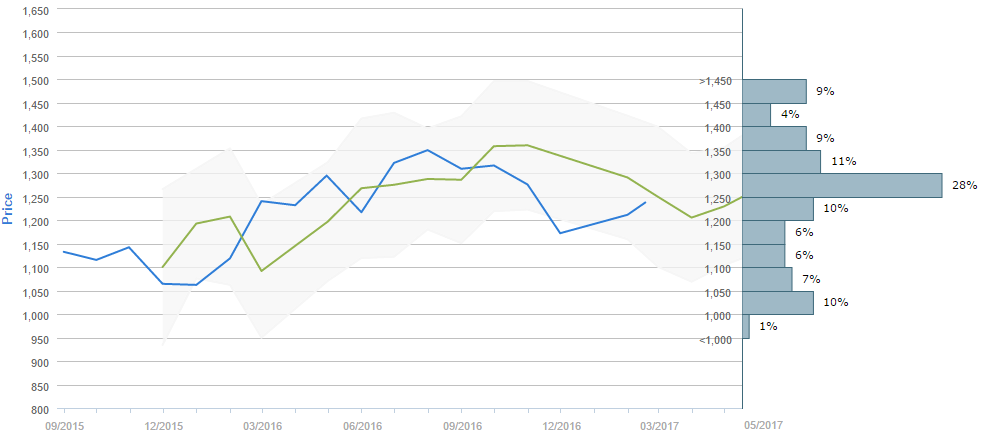 Traders who were asked regarding their longer-term views on gold between January 16 and February 16 expect, on average, to see the metal near 1,250 in May. Generally, 61% (+3%) of participants believe the price will be above 1,250 in ninety days. Alongside, 29% (-3%) of those surveyed reckon the currencies will trade in the range between 1,000 and 1,200 over the next three months.