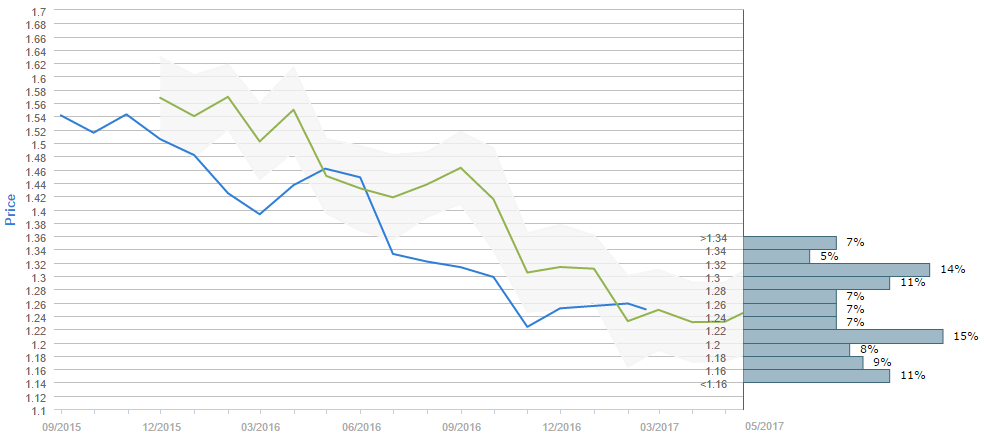 By the end of the next three months traders expect the Cable to rise above the 1.22 major level, as 55% of survey participants believe so. While the current price is around 1.25, the average forecast for May 14 is 1.2443. The 1.20-1.22 interval is now the most popular price interval, having 15% of the votes, while on the second place is the 1.30-1.32 price range, with 15% of poll participants choosing it. Furthermore, the 1.14-1.16 and the 1.28-1.30 intervals were chosen by 11% of the voters each.