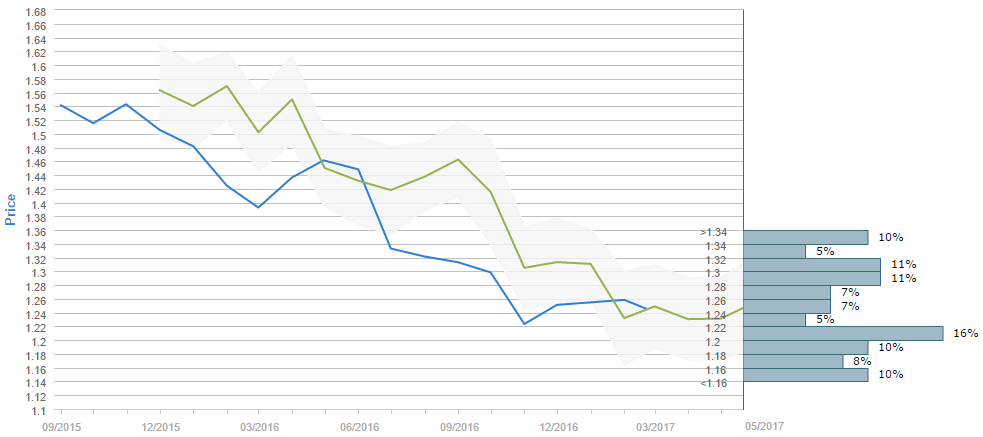 By the end of the next three months traders expect the Cable to rise above the 1.22 major level, as 56% of survey participants believe so. While the current price is around 1.25, the average forecast for May 20 is 1.2467. The 1.20-1.22 interval is now the most popular price interval, having 16% of the votes, while on the second place are the 1.28-1.30 and the 1.30-1.32 price ranges, both with 11% of poll participants choosing them. Furthermore, the 1.14-1.16, 1.18-1.20 and the 1.34-1.36 intervals were each chosen by 10% of the voters.