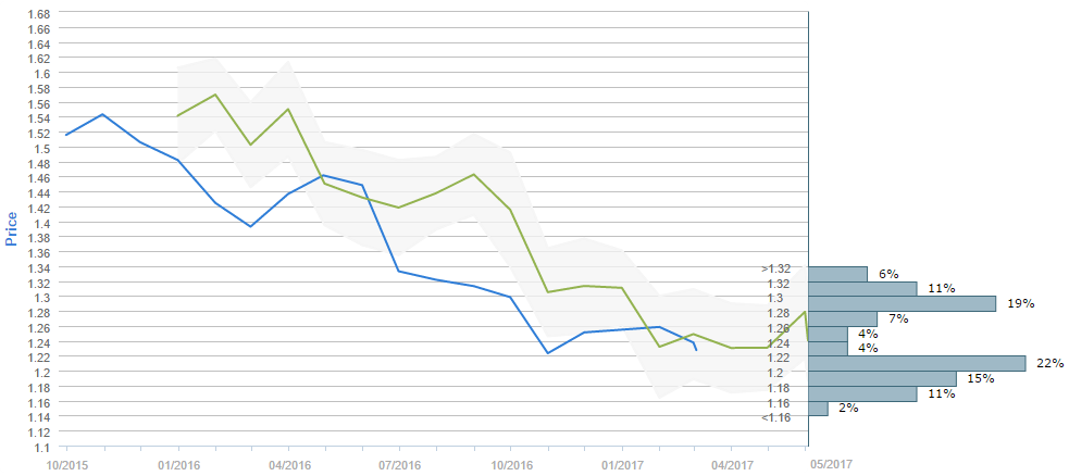 By the end of the next three months traders expect the Cable to rise above the 1.22 major level, as 51% of survey participants believe so. While the current price is around 1.24, the average forecast for June 02 is 1.2407. The 1.20-1.22 interval is now the most popular price interval, having 22% of the votes, while on the second place is the 1.28-1.30 price range, with 19% of poll participants choosing it. Furthermore, the 1.18-1.20 interval was each chosen by 15% of the voters.