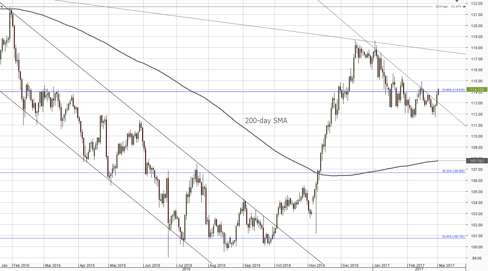 The breach of the bearish trend-line resulted in a surge above 114.00, with the 23.60% Fibo even being unable to limit the gains, for now at least. The pair is required to close above this area in order to continue appreciating, with the 115.00 being the next target. Once this major level is pierced, the pair will be able to reach the second down-trend near 117.00.