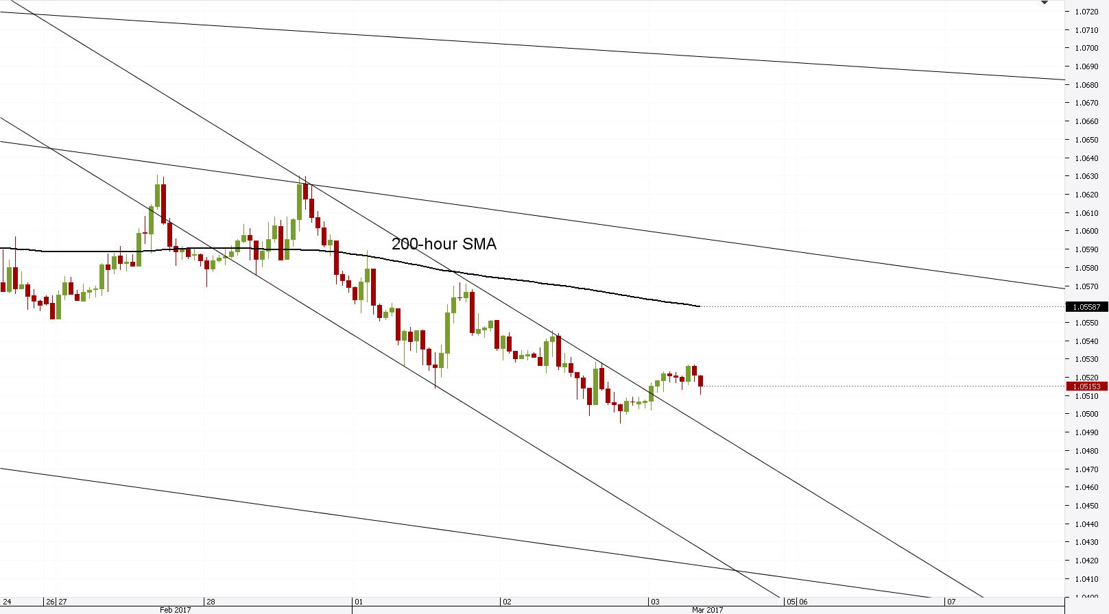 Hourly chart: The hourly chart first of all reveals that the previously described descending channel pattern has become obsolete, as it has done its task in directing the currency exchange rate to the weekly S1. However, the currency exchange rate rebounded before it touched the support level, as the 1.0495 level was the point of the rebound. The resulting rebound has been firmly moving northwards. Although, t is set to meet with a combined resistance of the 55-hour SMA and the upper Bollinger band before an attempt at the weekly PP, 100 and 200 hour SMAs near the 1.0560 level can be attempted.