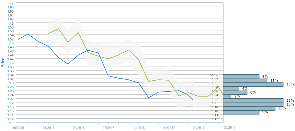 © Dukascopy Bank SABy the end of the next three months traders expect the Cable to fall under the 1.22 major level, as 52% of survey participants believe so. While the current price is around 1.22, the average forecast for June 14 is 1.2357. The 1.18-1.20, the 1.20-1.22 and the 1.28-1.30 ranges are now the most popular price intervals, with all three having 15% of the votes, while on the second place is 1.16-1.18 price range, both with 13% of poll participants choosing it. Furthermore, the 1.30-1.32 interval was chosen by 11% of the voters.