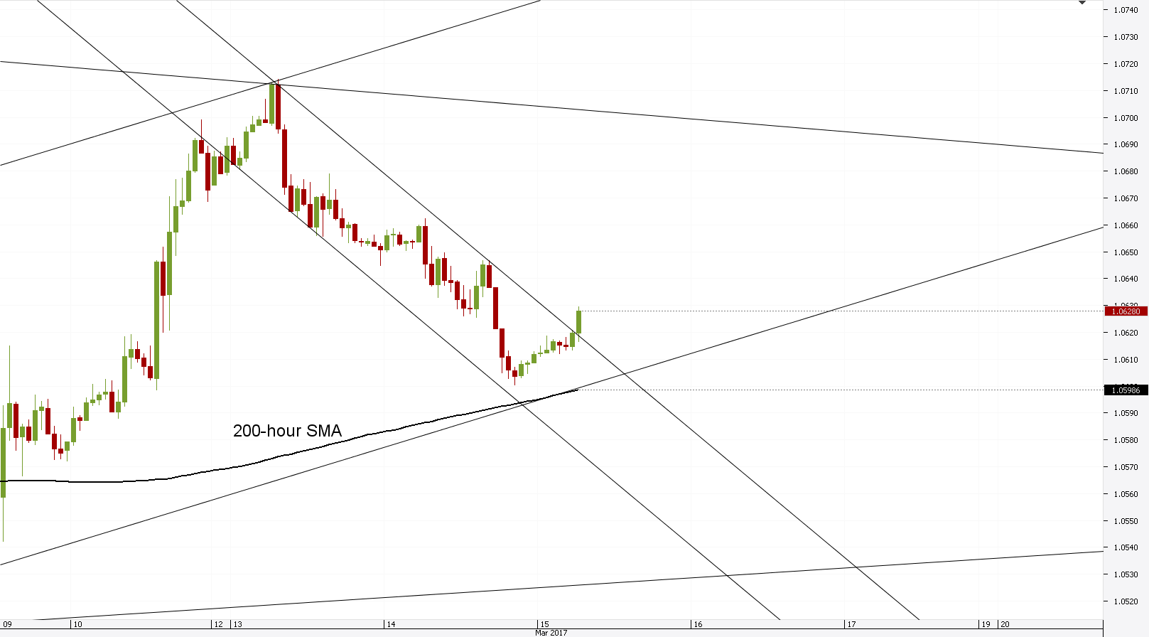 Hourly chart: The hourly chart shows that there is no short term pattern. The rate's movements are dictated by the fundamental bias, as even the Bollinger bands are being bent and are not showing enough force to change the currency pair's movement. However, one noticeable fact has changed. The 200-hour SMA at 1.0599 has come into a close enough range to begin providing significant support to the currency exchange rate.