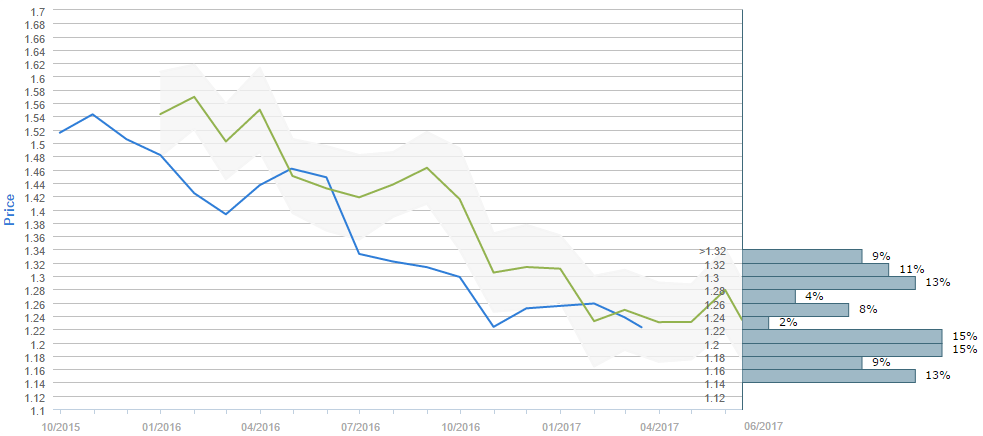 © Dukascopy Bank SABy the end of the next three months traders expect the Cable to fall under the 1.22 major level, as 52% of survey participants believe so. While the current price is around 1.22, the average forecast for June 15 is 1.2342. The 1.18-1.20 and the 1.20-1.22 ranges are now the most popular price intervals, with all three having 15% of the votes, while on the second place are 1.14-1.16 and the 1.28-1.30 price ranges, both with 13% of poll participants choosing them. Furthermore, the 1.30-1.32 interval was chosen by 11% of the voters.