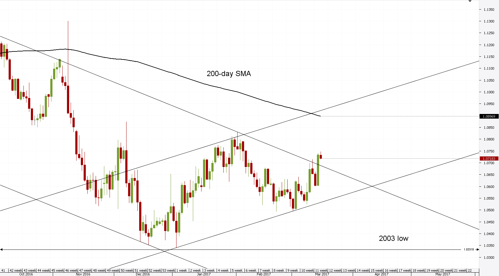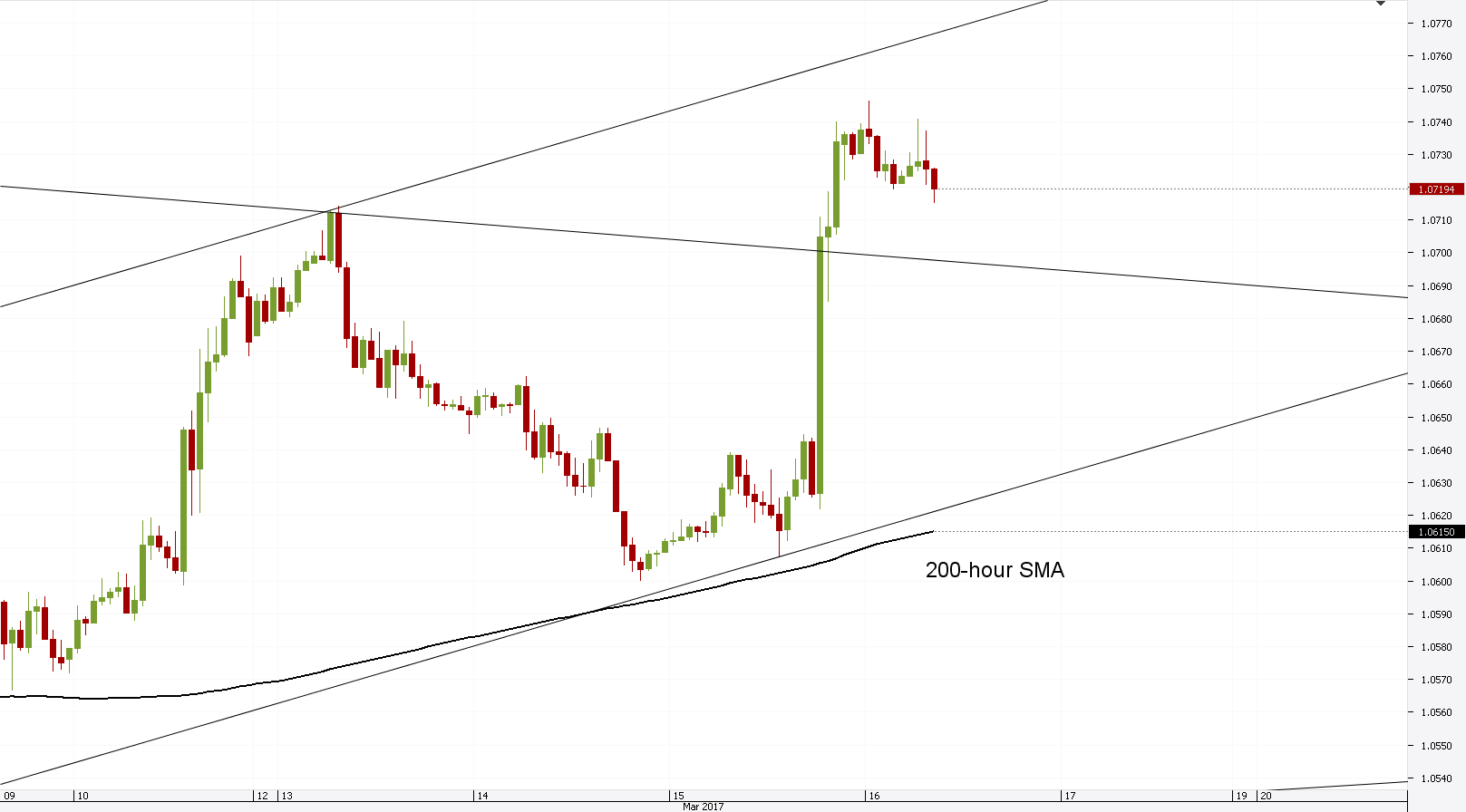 Hourly chart: The hourly chart shows that the jump was highly volatile and lasted for three hours. Since then the pair has made two attempts to break through the weekly R1. However, it can be seen that the pair is moving lower. It is likely that the pair will be hindered by the 20-hour SMA at 1.0703 and a combination of the 55 and 100-hour SMAs respectively at 1.0655 and 1.0658.