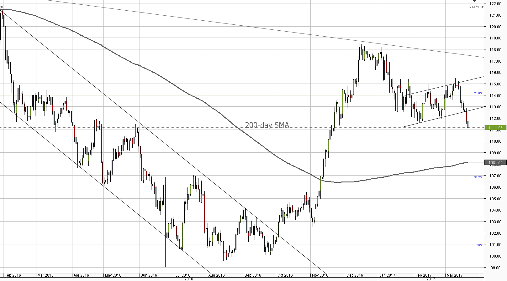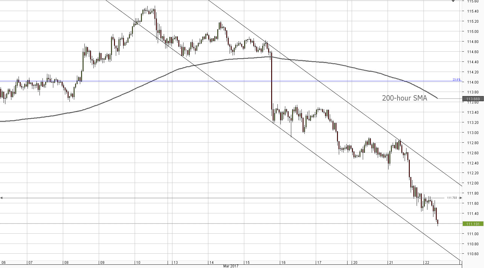 The USD/JPY currency pair appears to have formed a descending channel pattern once it began sliding down from 115.00. At the moment, the Buck is moving lower, towards the 111.00 mark, from where it will have an opportunity to reconfirm the lower trend-line of the channel and find sufficient support for a recovery.