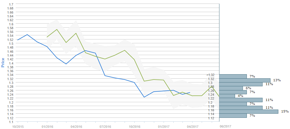 © Dukascopy Bank SABy the end of the next three months traders expect the Cable to fall under the 1.22 major level, as 51% of survey participants believe so. While the current price is around 1.23, the average forecast for June 23 is 1.227. The 1.14-1.16 range is now the most popular price interval, having 15% of the votes, while on the second place is the 1.30-1.32 price range, with 13% of poll participants choosing it. Furthermore, the 1.16-1.18, the 1.20-1.22 and the 1.28-1.30 intervals were each chosen by 11% of the voters.