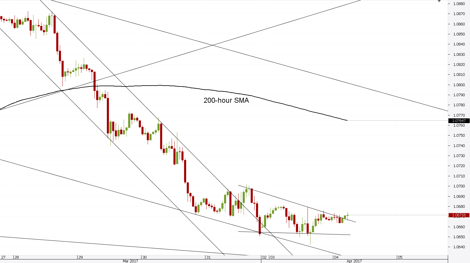 EUR/USD showed no surprises Tuesday morning, working on confirming the channel down pattern on the hourly chart and lying steadily below the latest resistance cluster. Upside is currently limited more than the area beneath, meaning that risks might shift to the downside – and the small red candle tells us that the pair could already be on its way to tests the 23.6% Fibo at 1.0639. It is, however, too early to tell as the downward movement is not strong enough just yet.