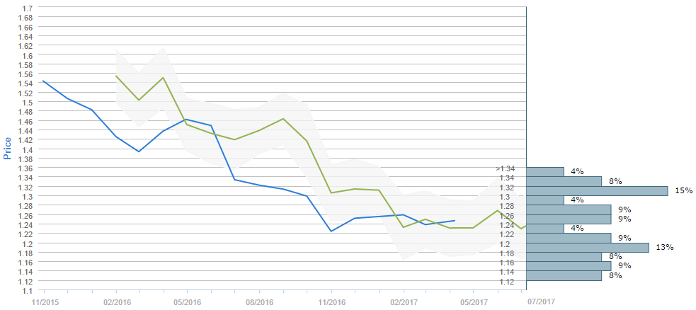 By the end of the next three months traders believe the Cable is to rise above the 1.22 major level, as 54% of survey participants believe so. While the current price is around 1.25, the average forecast for July 06 is 1.2353. The 1.30-1.32 range is now the most popular price interval, having 15% of the votes, while on the second place is the 1.18-1.20 price range, with 13% of poll participants choosing it. Furthermore, the 1.14-1.16, the 1.20-1.22, the 1.24-1.26 and the 1.26-1.28 intervals were each selected by 9% of voters.