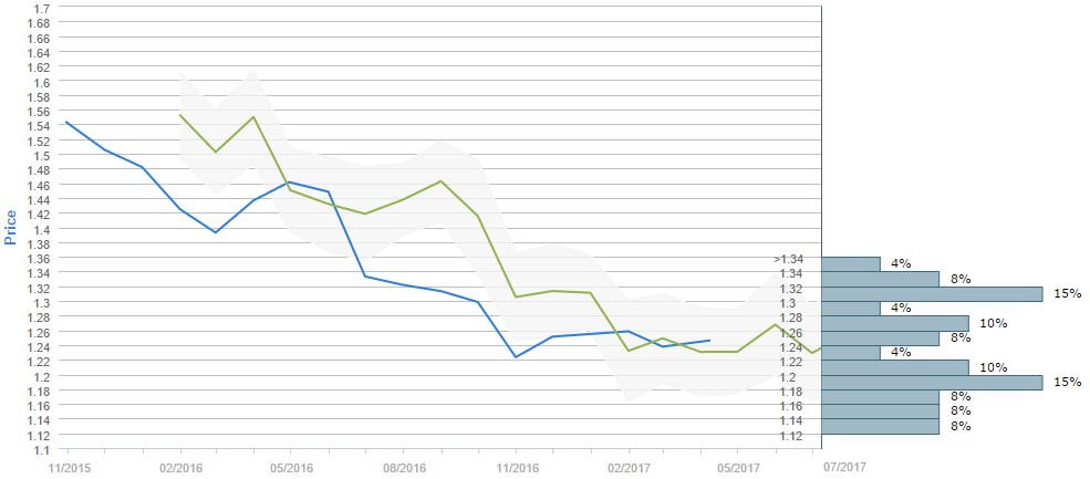 By the end of the next three months traders believe the Cable is to rise above the 1.22 major level, as 53% of survey participants believe so. While the current price is around 1.25, the average forecast for July 07 is 1.2358. The 1.18-1.20 and the 1.30-1.32 ranges are now the most popular price intervals, having 15% of the votes each, while on the second place are the 1.20-1.22 and the 1.26-1.28 price ranges, with 10% of poll participants choosing each of them.