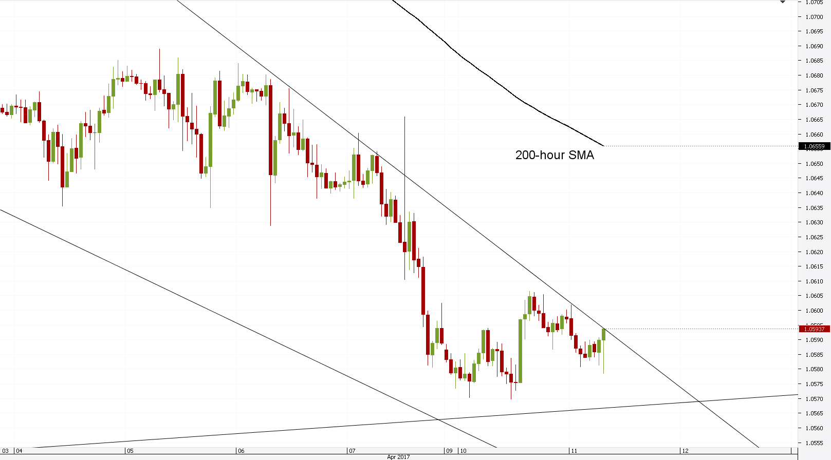 Hourly chart: The hourly chart reveals that the currency price attempted a rebound after reaching the 1.0570 mark. However, the subsequent surge was stopped by the upper trend line of the Falling wedge pattern. The currency exchange remained near that trend line during the morning hours. The trend line was being approached by the 55-hour SMA, which was located at the 1.06 mark. Meanwhile, with the exception of the lower Bollinger band of the hourly chart the pair had no support as low as 1.0550.