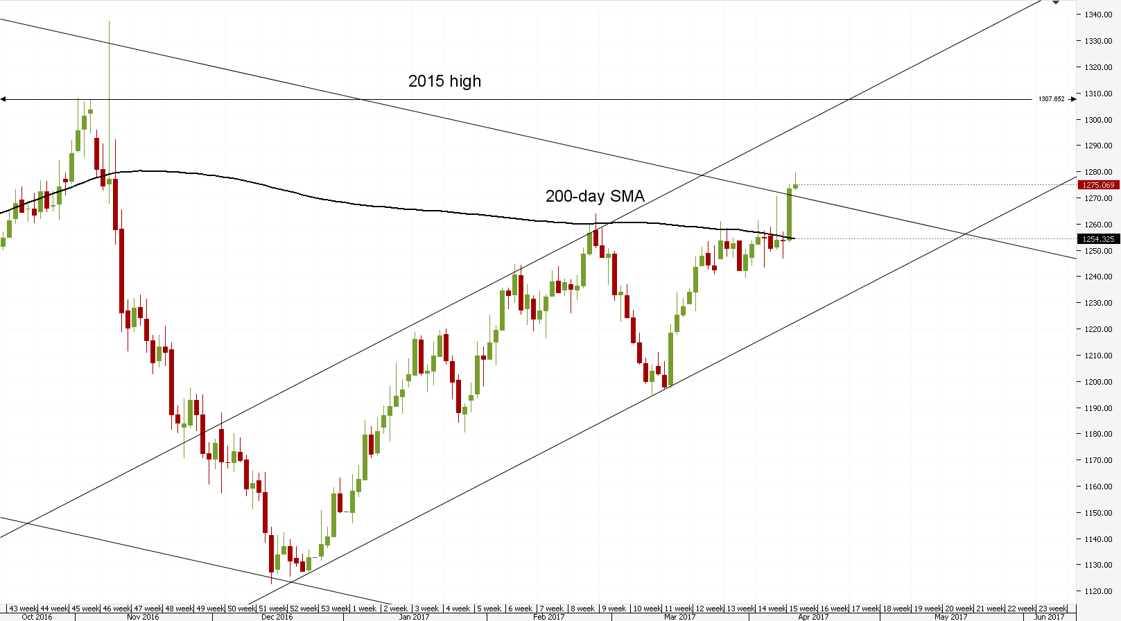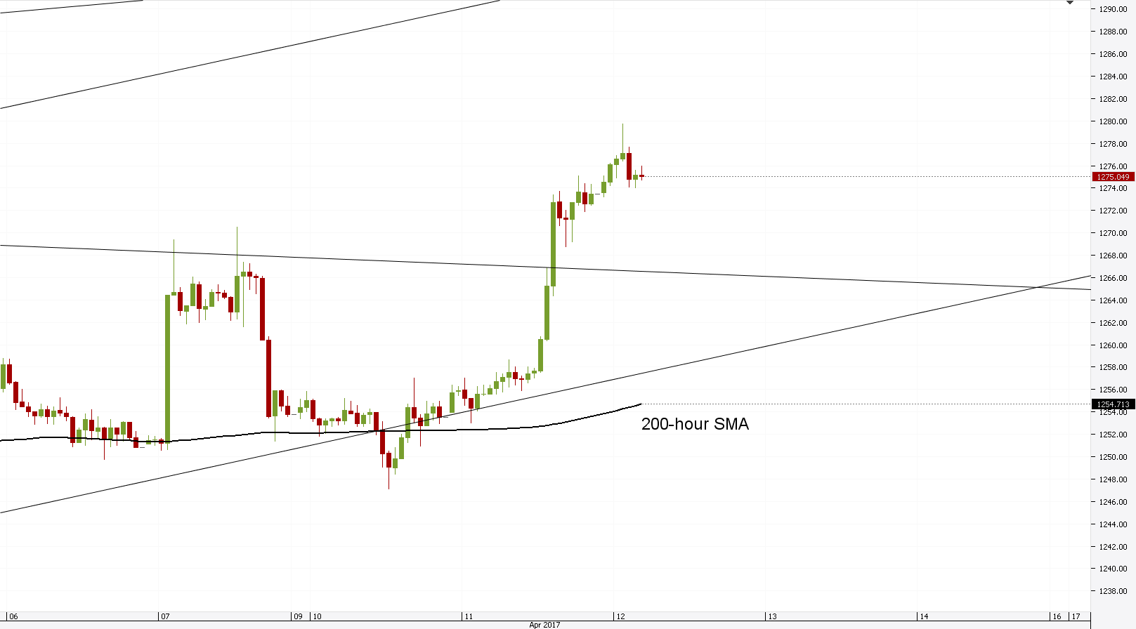 Daily chart: The US and Russian tensions over Syria and North Korean nuclear threats are the driving force behind the surge in the value of the yellow metal. Due to the combined effect of the global political turmoil a run to safety has caused the bullion's price to jump and touch the 1,280 level on Wednesday morning, which is a two percent increase, if compared to Tuesday's opening price. It is most likely that the fundamentals will continue to dictate the fluctuations in the commodity price, as technical analysis has become impaired on the daily chart.Daily chart